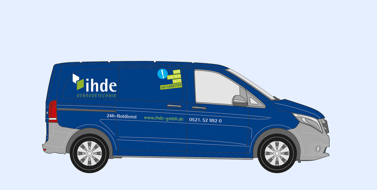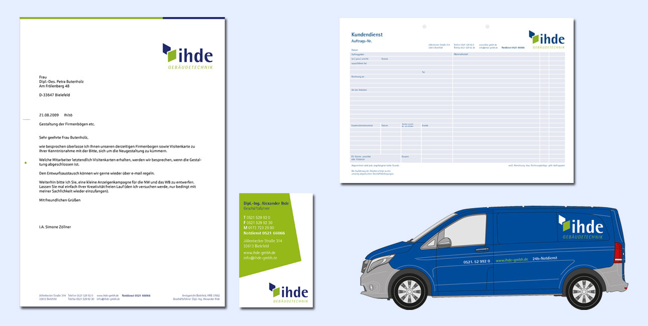 Für die Firma Ihde Gebäudetechnik GmbH arbeite ich schon seit vielen Jahren. Anfangs bestand der Wunsch, das bestehende Logotype nur etwas zu überarbeiten, da der Mut zu einer umfassenden Veränderung fehlte. Nach stetigem Wachstum der Firma entstand 2016 doch der Wunsch, ein komplett neues Corporate Design zu wagen.