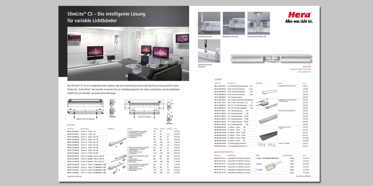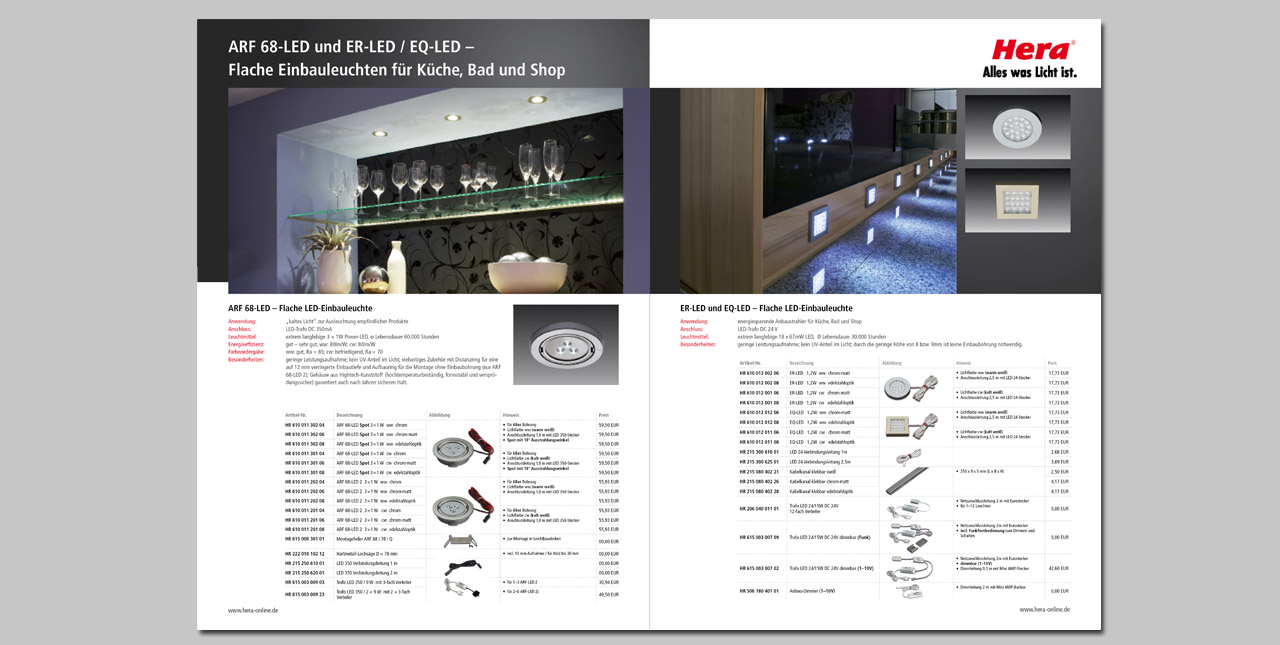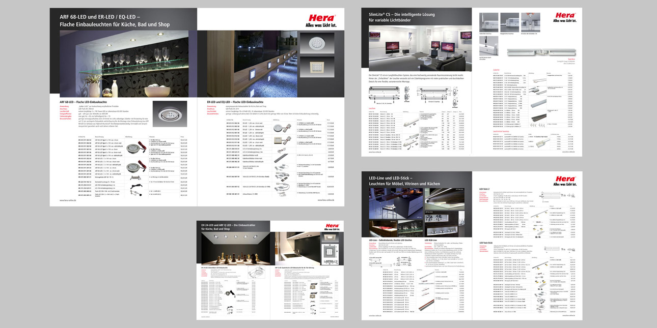 Die Hera GmbH hatte den Wunsch, für einen Sonderkatalog ihr Katalogkonzept zu überarbeiten. Die neue Gestaltung sieht größere Fotos und ein nicht so massives Tabellendesign vor. Die Übersichtlichkeit war oberstes Gebot, aber wichtig war auch ein ansprechendes Gesamtbild, adäquat zu dem Umfeld, in denen die Leuchten eingesetzt werden.